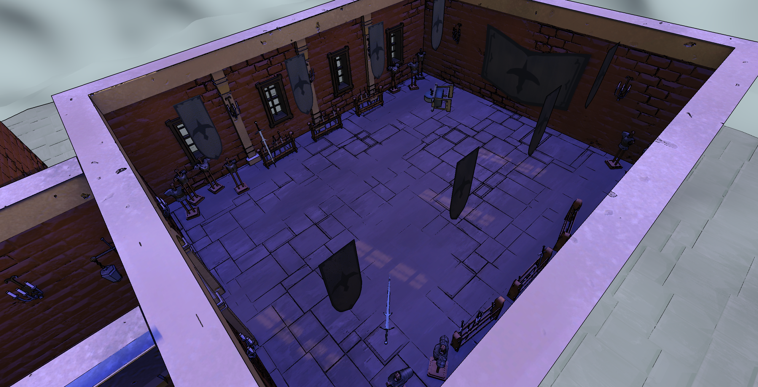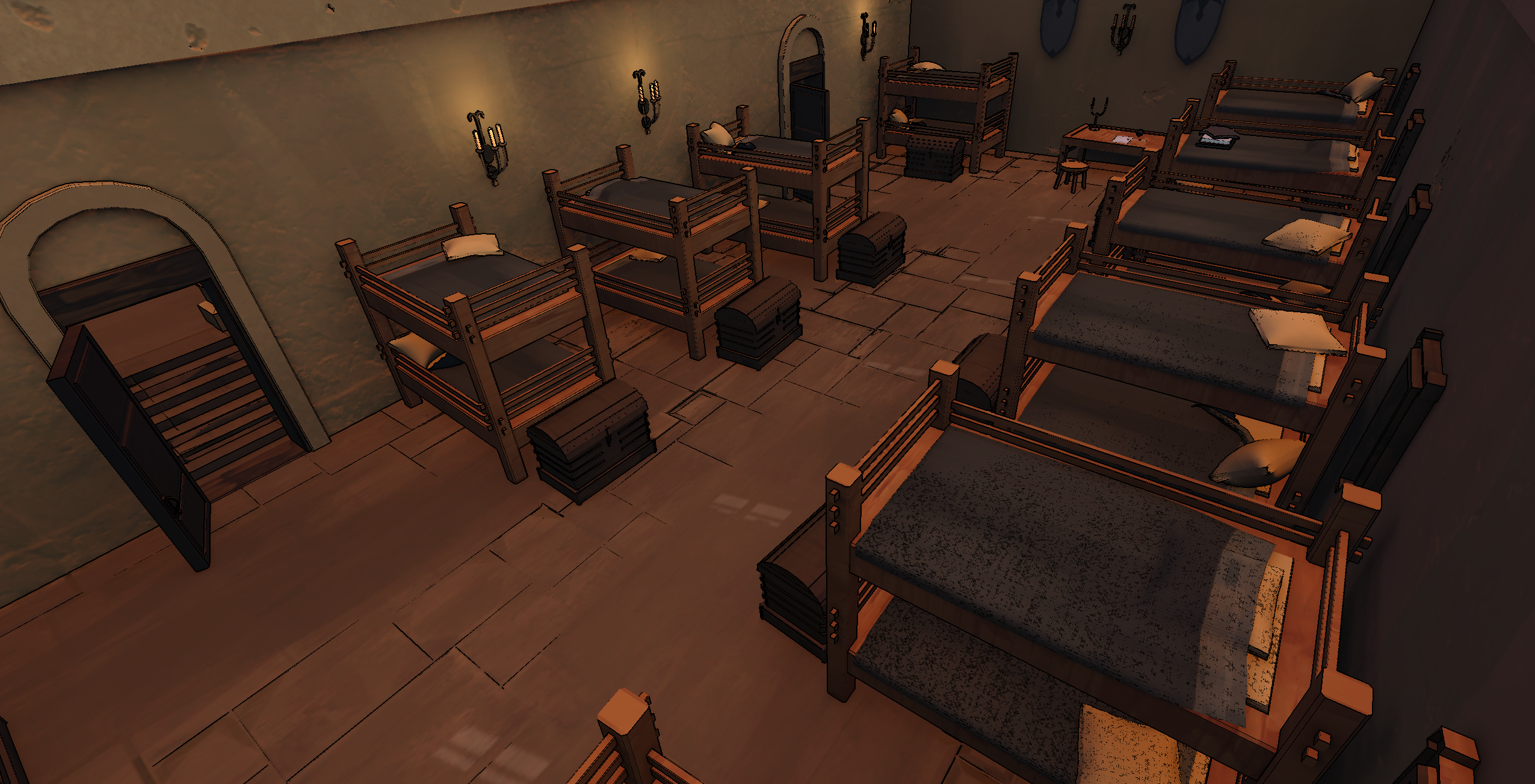 The secondary environment is the knights’ barracks, where the main character and his fellow protectors of the kingdom spend their spare time. Here, it was important to me to showcase the difference in treatment between characters based on social standing - the main character and the general have large, single-person rooms, while the younger cadets all sleep in a large communal bedroom. All of that is put together by a large training room, which is the focal point of the building.