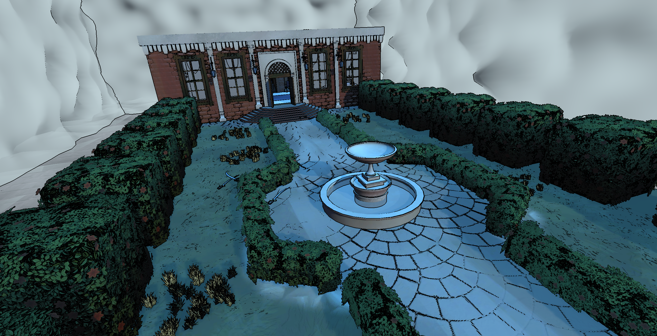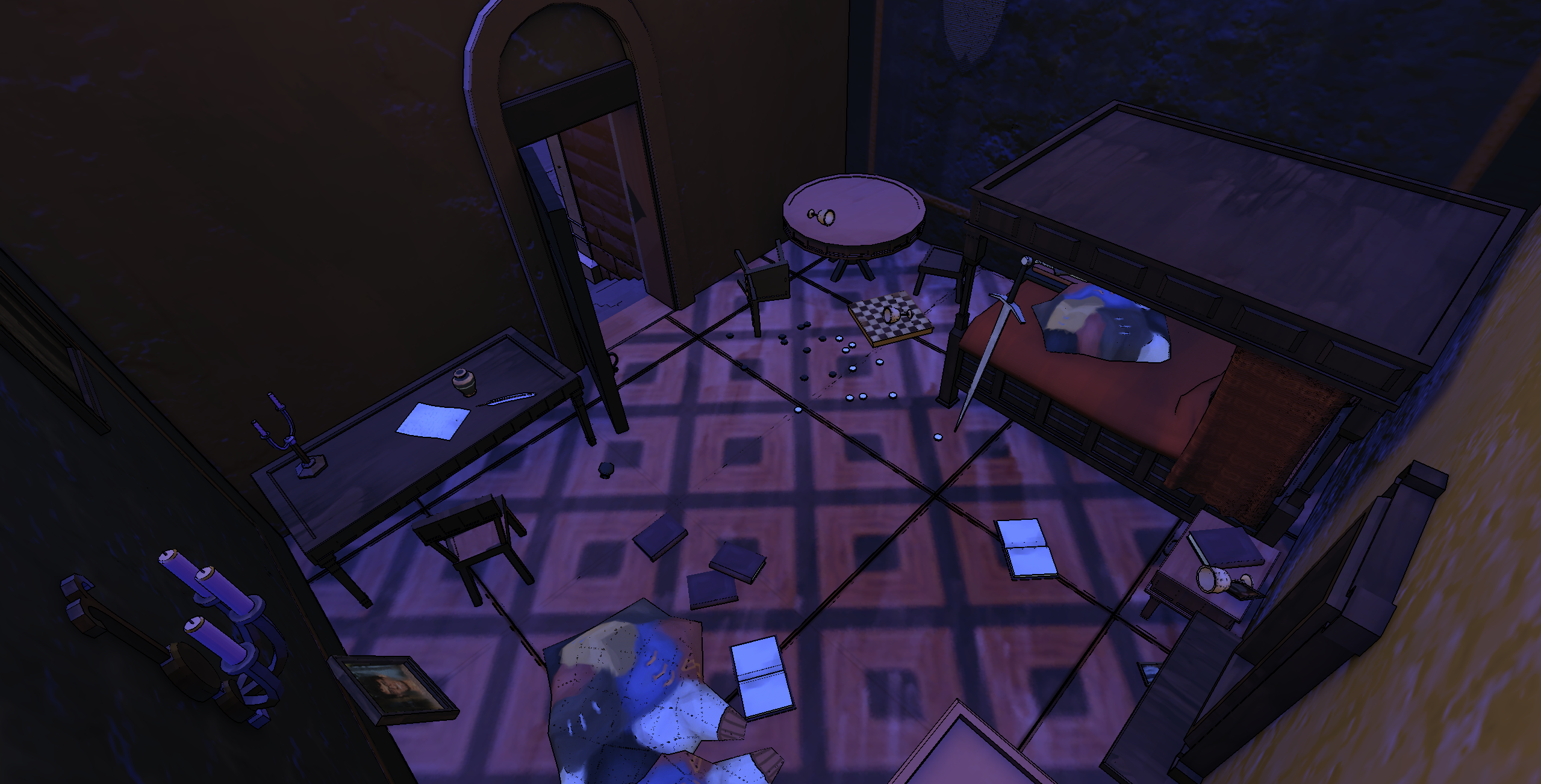 The main challenge of creating the project's environment was keeping them interesting while reusing the same scene in the narrative, with the entirety of the story happening on the castle grounds. I achieved that through changes in lighting between the story's timestamps. Each beat has its own color light overlay, with the colors getting colder and darker toward the end of the game.
