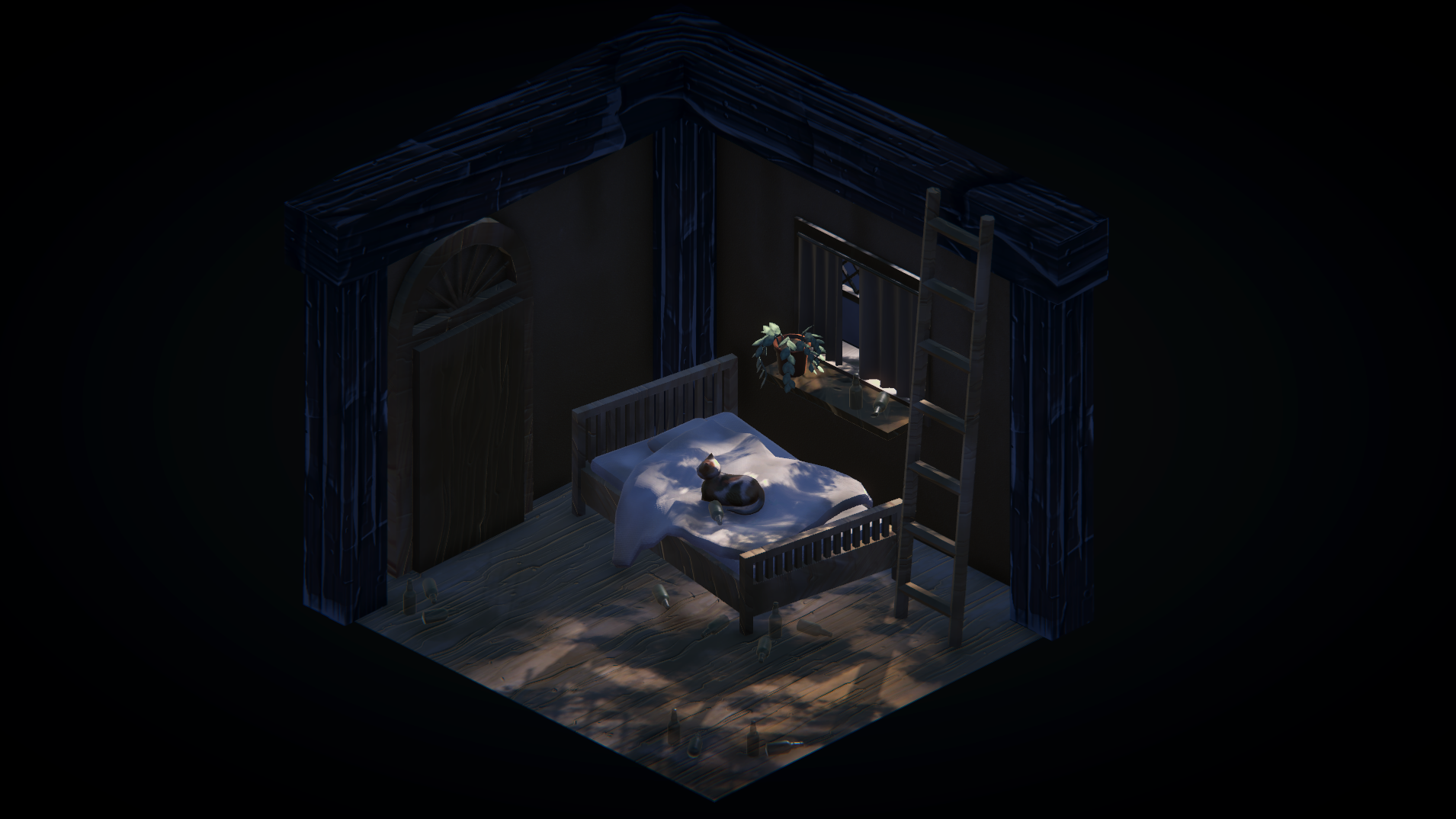 The main challenge of creating the project's environment was keeping them interesting while reusing the same scene in the narrative, with the entirety of the story happening on the castle grounds. I achieved that through changes in lighting between the story's timestamps. Each beat has its own color light overlay, with the colors getting colder and darker toward the end of the game.