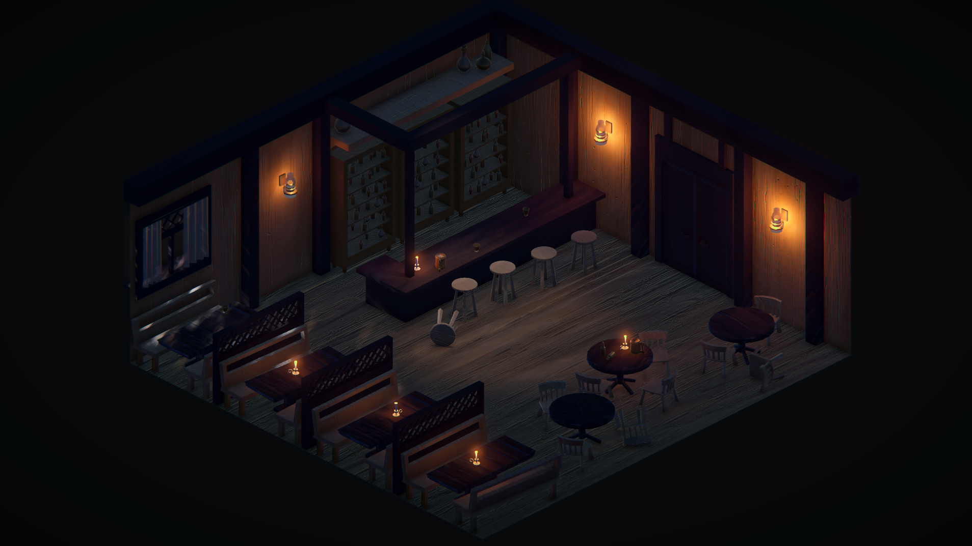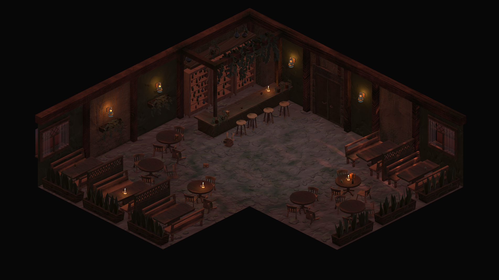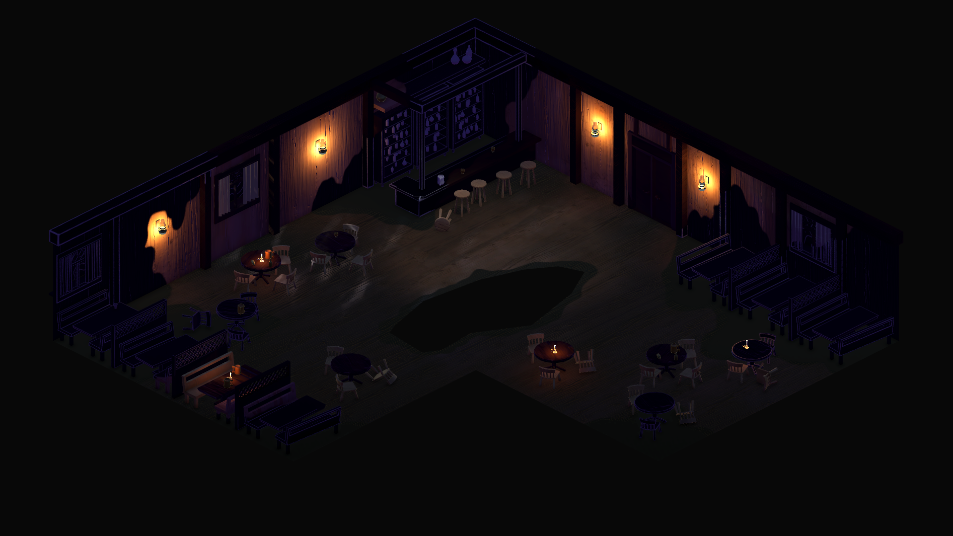 The first tavern is a regular bar with dim lighting and wooden details. It represents denial - the character's lack of acknowledgement that he has a problem that needs a solution deeper than being at the bottom of the bottle. The space is small, which makes for a simpler fight, as neither of the characters can do much beyond landing direct hits. It's the most down-to-earth environment.