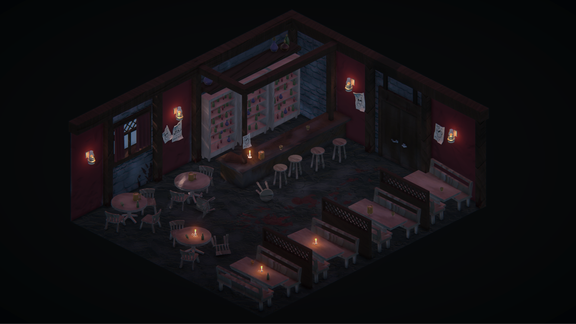 The second tavern has a slightly more crude feel to it, representing anger. Here, some more brutal enemy attacks are uncoveered, and the characters get more room to move around. The tavern also has multiple posters advertizing a fighting ring where the owner is a champion. The colo scheme of the tavern is centered around the color red, to add to the aggressive feel of the space.