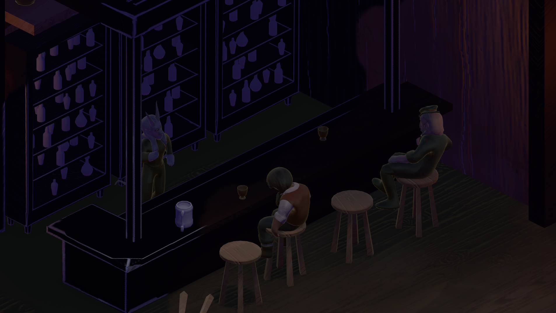The taverns get interrupted by a visual-novel-style cutscene representing bargaining, where the protagonist has an argument with the primary antagonist - the old man. The environment for the conversation is a slightly run-down building passed on the way to the next bar. The bargaining is represented by the change to an outside space - the main character is convinced that he can change, and he is going between bars out of his own free will.